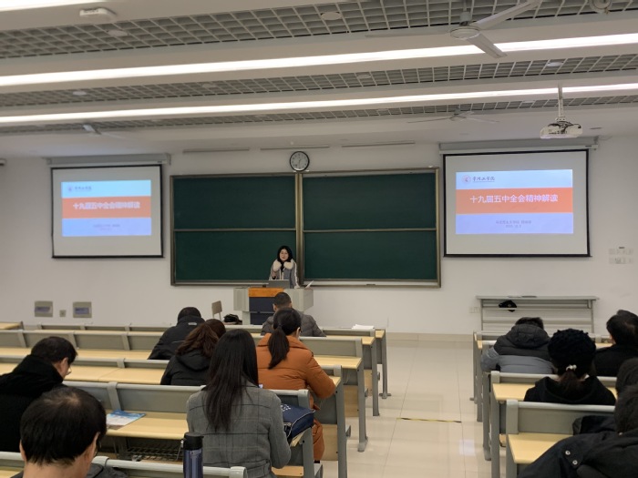 12月2日下午,马克思主义学院教师程凌绡应邀为永利官网全体教职工作党的十九届五中全会精神宣讲报告。永利官网经理兼党总支书记陈荣军主持会议。